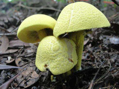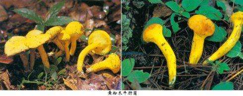 主要鉴别特征:颜色鲜艳,菌盖与菌柄表面敷有柠檬黄色细粉末,采摘时可沾手指。菌盖半球形,菌肉黄色至白色,菌柄中实。