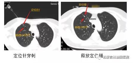 CT科臧文远医生:“这项技术一般要求将定位锚释放到肺结节旁1cm范围内,由于我科在肺结节穿刺活检基础上开展的这项技术,我们对定位锚释放位置有更高要求,一般我们会把定位锚和病灶距离控制到0.5cm以内,这样术中可以保留更多肺组织。对于肺内微小结节(直径小于0.5cm)我们也能准确定位,临床医生对主病灶进行切除的同时,对其它的一些小病灶一起切除,为患者除掉安全隐患” 。