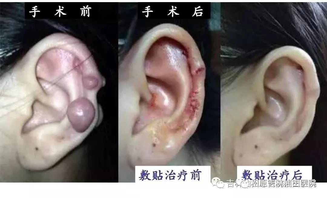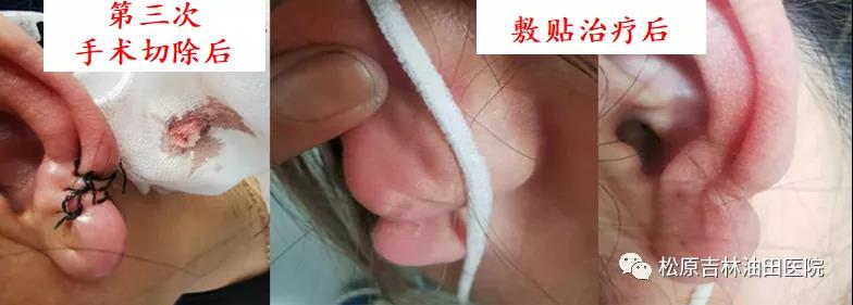 而另一位患者小雨,就没有这么幸运了,同样,她也是因为“打耳洞”导致了瘢痕疙瘩,但由于对治疗方式的不了解,前两次仅仅是做了瘢痕疙瘩的局部切除术,并未行“锶-90敷贴治疗”,导致该部位再次出现瘢痕疙瘩、并且增生的速度比未手术时还要快。由于耳廓部位皮肤有限,第三次局部切除术后,小雨的耳廓已经出现了缺口,影响了美观。小雨听说松原吉林油田医院核医学科有“锶-90敷贴治疗”,在第三次局部瘢痕疙瘩手术后,她立即来核医学科进行“锶-90敷贴治疗”,这一次的治疗效果与之前的两次对比,令她十分满意。让我们来看看小雨的治疗效果(下图)。