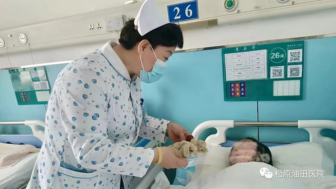 在治疗期间,医护人员每天给她喂水喂饭,端屎端尿,充当了大娘的家人,给予大娘以家的温暖,亲人的关怀。因为大娘每天睡眠质量不好,每天醒的很早,所以温大夫每天都早早的就来给大娘换药,以保证大娘白天能充分的休息。护士长王媛媛带领护士及时观察她的生命体征变化,落实各项护理措施,悉心照顾大娘的生活起居。