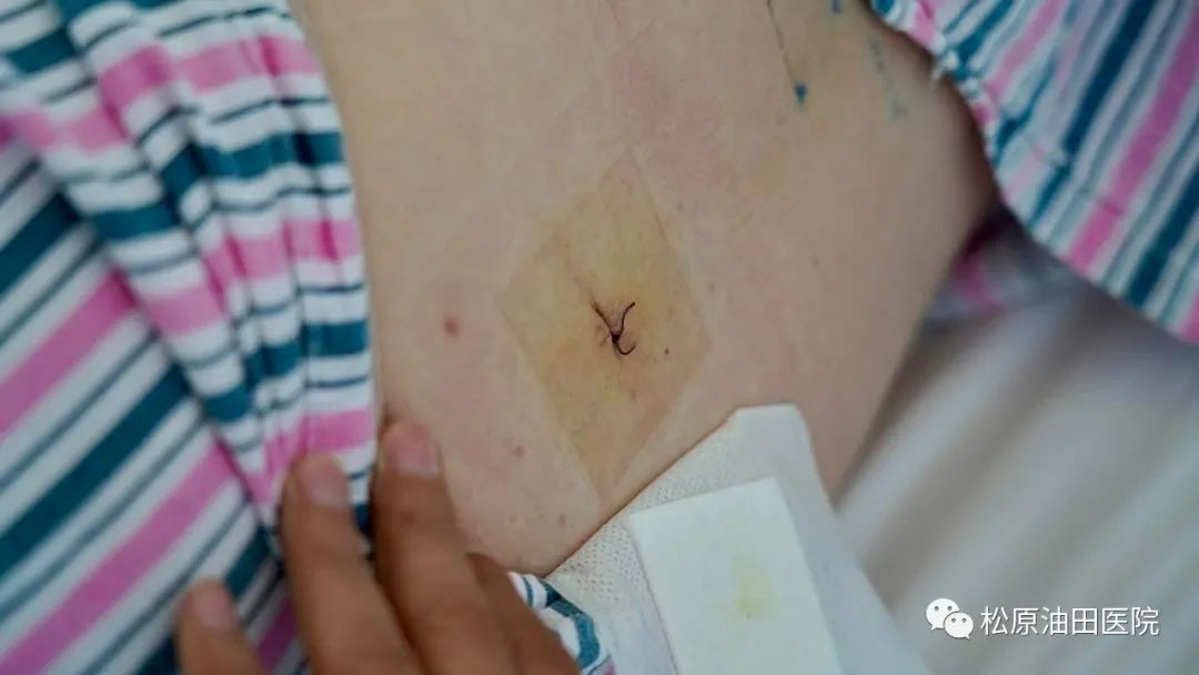 患者腰部后侧切口仅有一公分左右大小,缝合一针,患者术后下肢疼痛症状基本消失,左下肢直腿抬高试验由术前30度阳性到术后阴性,治疗效果显著,患者第二日下地后,腰痛及左下肢疼痛症状已消失,对于治疗也非常满意。